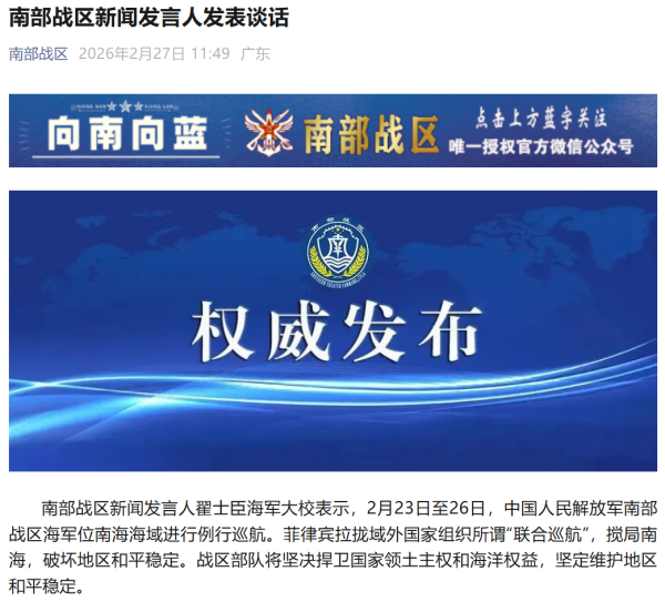 据南部战区微信公众号2月27日消息,南部战区新闻发言人翟士臣海军大校表示,2月23日至26日,中国人民解放军南部战区海军位南海海域进行例行巡航。菲律宾拉拢域外国家组织所谓"联合巡航",搅局南海,破坏地区和平稳定。战区部队将坚决捍卫国家领土主权和海洋权益,坚定维护地区和平稳定。