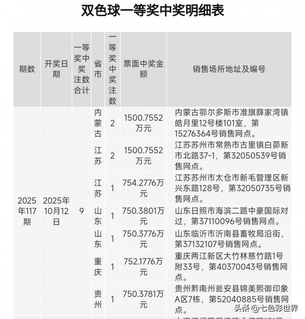双色球第25117期一等奖明细介绍!江苏、内蒙古彩民各中1500万大奖