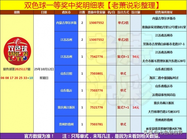 好,以上就是双色球第25117期一等奖明细介绍,感谢您的阅读,我们下期再会!最后依旧是温馨提示:购彩有风险,请量力而行!