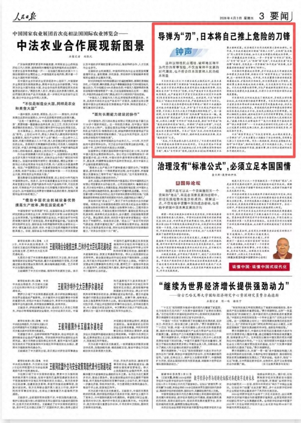 4月3日,《人民日报》03版"钟声"发表评论文章《导弹为"刃",日本将自己推上危险的刀锋》。文章中写道:这种以牺牲民众福祉、破坏地区和平为代价的军事冒险,不仅违背和平发展的时代潮流,也不符合日本国家和人民的根本利益。
