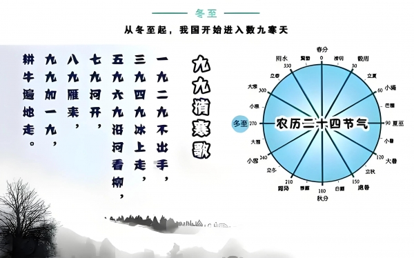 冬至之前通常不会很冷,真正的严寒在冬至之后。所以,古人早在冬至之后开始计算"数九寒天",在民间有"夏至三庚入伏,冬至逢壬数九"的民谚。