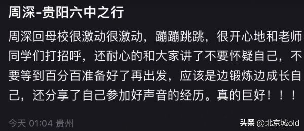 粉丝们的高能表现,呈现出来的画风,给人感觉既治愈,又暖心,周深也不负众望,等到节目组在贵阳母校六中录制完后,按理来说,全体成员应该登上车直接离开现场,得知门外还有一大群粉丝在等自己时,主动从车上跑下来到校门口跟大家打招呼。