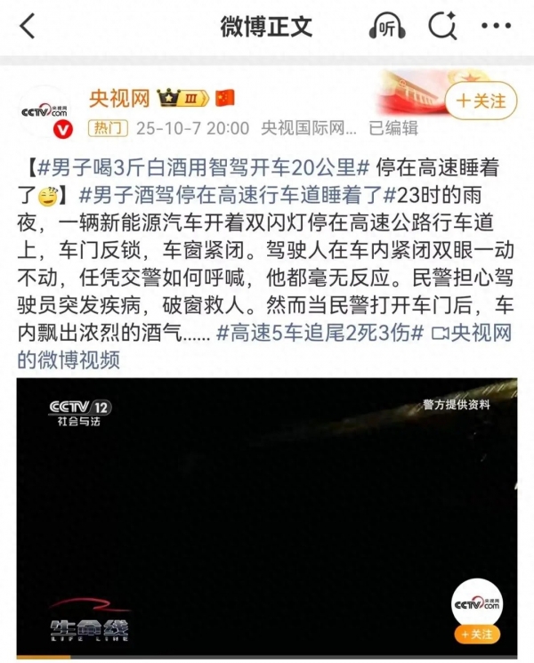 据央视网官方微博10月7日晚上8时许报道,23时的雨夜,一辆新能源汽车开着双闪灯停在浙江杭州的一条高速公路行车道上,车门反锁,车窗紧闭。驾驶人在车内紧闭双眼一动不动,任凭交警如何呼喊,他都毫无反应。民警担心驾驶员突发疾病,破窗救人。然而当民警打开车门后,车内飘出浓烈的酒气。男子告诉交警,他连续喝了两场酒,一共约3斤白酒。