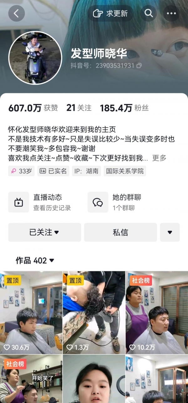 "发型师晓华"目前在抖音平台拥有185.4万粉丝。