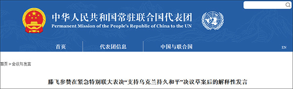 据中国常驻联合国代表团网站2月24日消息,中国常驻联合国代表团参赞滕飞在紧急特别联大表决"支持乌克兰持久和平"决议草案后进行解释性发言。