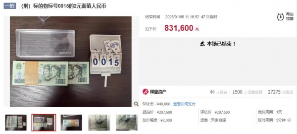 本场拍卖共有44人报名,共竞价125轮,27275次围观。据悉,该拍品起拍价、评估价均为20.76万元,最终成交价较之溢价4倍有余。