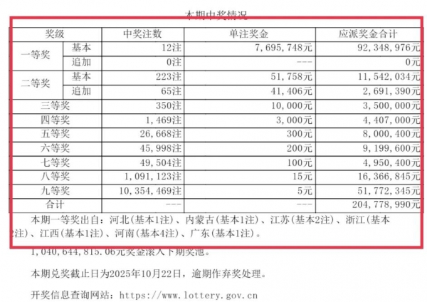 二等奖中出223注基本投注(单注奖金5.17万元)和65注追加投注(单注奖金4.14万元)。三等奖至九等奖的中奖注数也十分可观,总派奖金额超过2.04亿元。