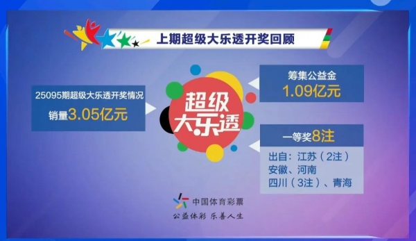 2025年8月23日,中国体育彩票超级大乐透迎来第25096期开奖。本期全国销量达到3.32亿元,为社会筹集公益金1.19亿元。