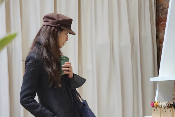 还戴着一个褐色的贝雷帽,手上提着一看就价值不菲的包包。