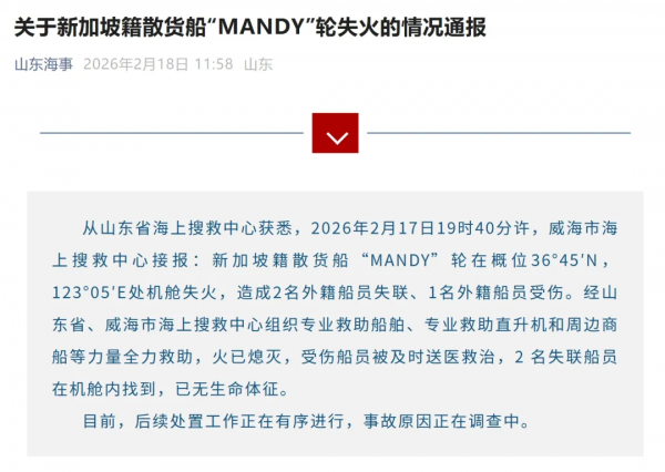 2月18日,据山东海事微信公号消息,从山东省海上搜救中心获悉,2026年2月17日19时40分许,威海市海上搜救中心接报:新加坡籍散货船"MANDY"轮在概位36°45′N,123°05′E处机舱失火,造成2名外籍船员失联、1名外籍船员受伤。经山东省、威海市海上搜救中心组织专业救助船舶、专业救助直升机和周边商船等力量全力救助,火已熄灭,受伤船员被及时送医救治,2名失联船员在机舱内找到,已无生命体征。