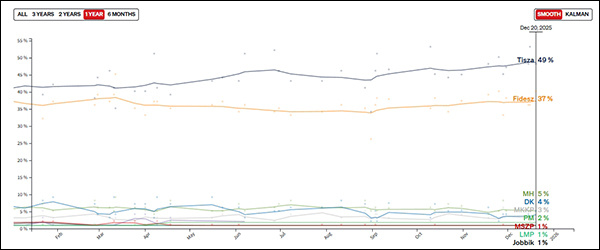 截至2025年12月20日,匈牙利主要政党的民调数据 "政客新闻网"欧洲版