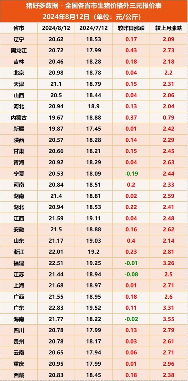 据猪好多数据监测显示,8月12日,全国外三元生猪均价为21.05元/公斤,较昨日上涨0.12元/公斤。从各省市来看,今日全国猪价继续保持大面积上涨态势,27省市猪价同频上扬,其中黑两江、内蒙古、山东单日涨幅高达0.37-0.43元/公斤,养猪利润进一步扩大。