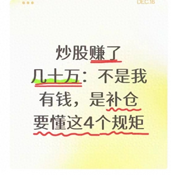 补仓是炒股的"纠错工具",不是"赚钱捷径",只有遵守4条铁律,才能让补仓从"越补越套"变成"越补越赚"。记住,补仓的核心是"选对标的、分批买入、看量操作、严格止损",少了任何一条,都可能掉进亏损的陷阱。