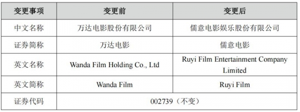 万达电影4月19日晚间发布公告称,自4月20日起,万达电影公司名称正式变更为"儒意电影娱乐股份有限公司"(下称儒意电影),公司证券代码"002739"保持不变。这意味着该公司在名称上彻底撕去王健林时代留下的"万达"标签。