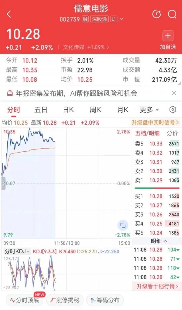 4月20日开盘,儒意电影股价上涨。截至发稿前,其股价涨幅为2.09%,报10.28元/股,市值为217.09亿元。