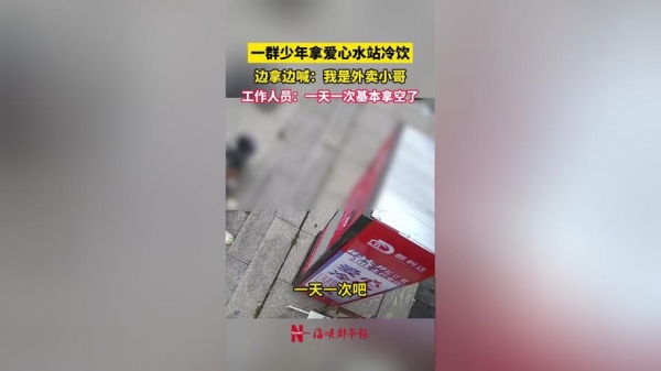 近日,天津。一群少年拿走爱心水站冷饮,边拿边喊:我是外卖小哥!工作人员:一天一次基本拿空了!