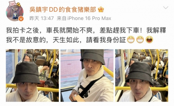 11月4日,63岁吴镇宇在香港乘公交刷老年卡,因头戴渔夫帽、打扮时尚显年轻,被司机质疑冒用证件险些赶下车。他当场掏身份证自证1961年出生,幽默回应"天生如此,请看身份证"。