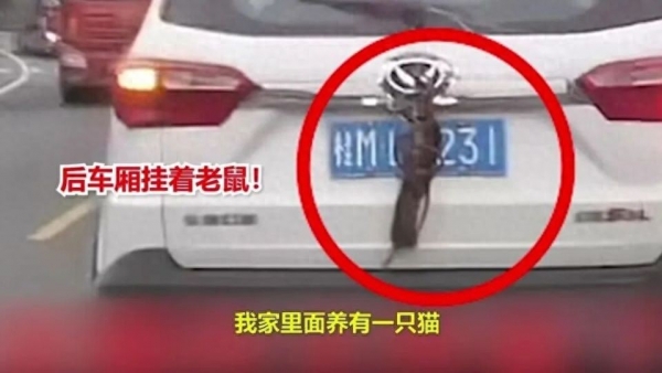 司机将两只老鼠挂后窗雨刮器上,挡住部分车牌,称"带回家给猫吃"