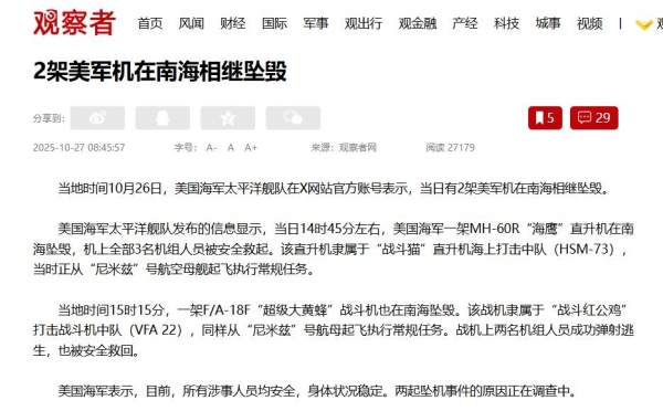 短短半个小时内,两架美军舰载机相继坠海,一架是MH-60R"海鹰"直升机,另一架是F/A-18F"超级大黄蜂"战斗机,事故发生之快、之密,不禁让人怀疑这背后到底隐藏着怎样的秘密。