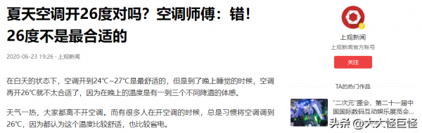 参考资料:上观新闻2020年6月23日--夏天空调开26度对吗?空调师傅:错!26度不是最合适的