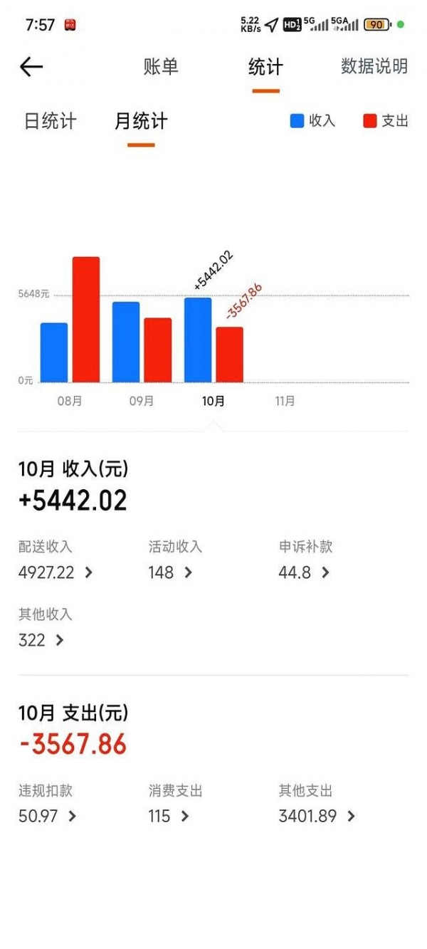 但其中有451元是之前月份的社保补贴,所以纯粹靠跑单挣来的钱是5037元。