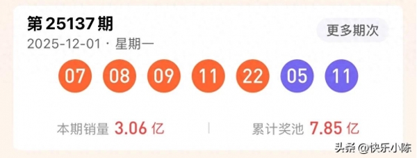 2025年12月1日21:25,超级大乐透第25137期开奖准时揭晓,前区7、8、9、11、22与后区5、11的组合,让江苏一位幸运儿斩获6774667元一等奖。本期全国销量达3.06亿元,奖池滚存至7.84亿元,江苏这注头奖成为当晚长三角地区的幸运焦点。