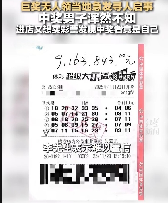 差点成一张废纸! 巨奖无人领当地急发寻人启事 中奖男子浑然不知 ,进店又想买彩票发现中奖者竟是自己,900万大奖得主一个月后才知中奖,2025年11月末,云南省临沧市体彩销售网点中出一注大乐透一等奖,中奖者却迟迟未现身。