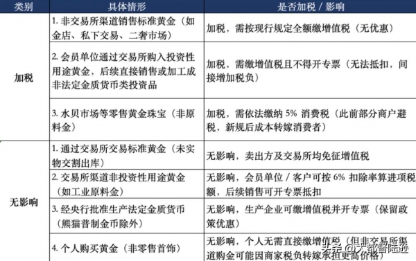 这里罗列一个具体的表格给大家看下。简单来说,就是你如果从上海黄金交易所、上海期货交易所去把实物黄金给买出来的话,那就要缴纳这部分增值税了。