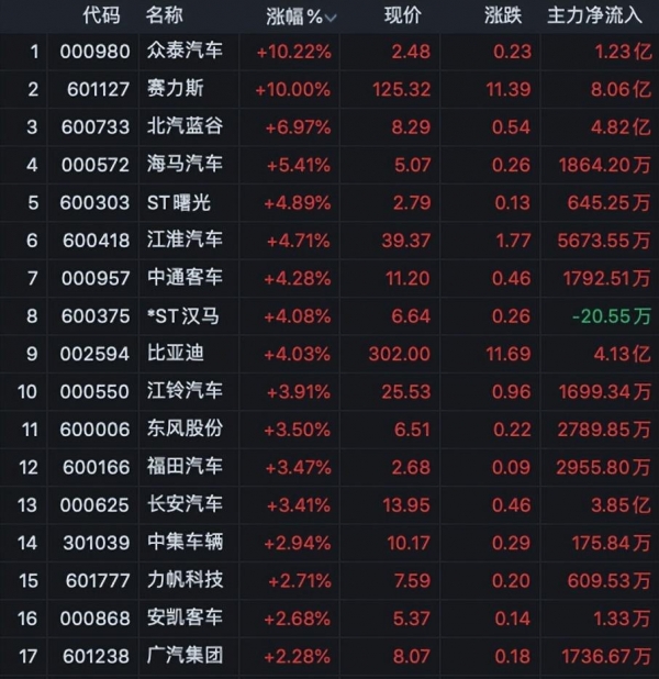 汽车整车股拉升,赛力斯触及涨停,股价续创历史新高。众泰汽车封板,北汽蓝谷、江淮汽车、中通客车、比亚迪等跟涨。港股汽车股也持续走高。