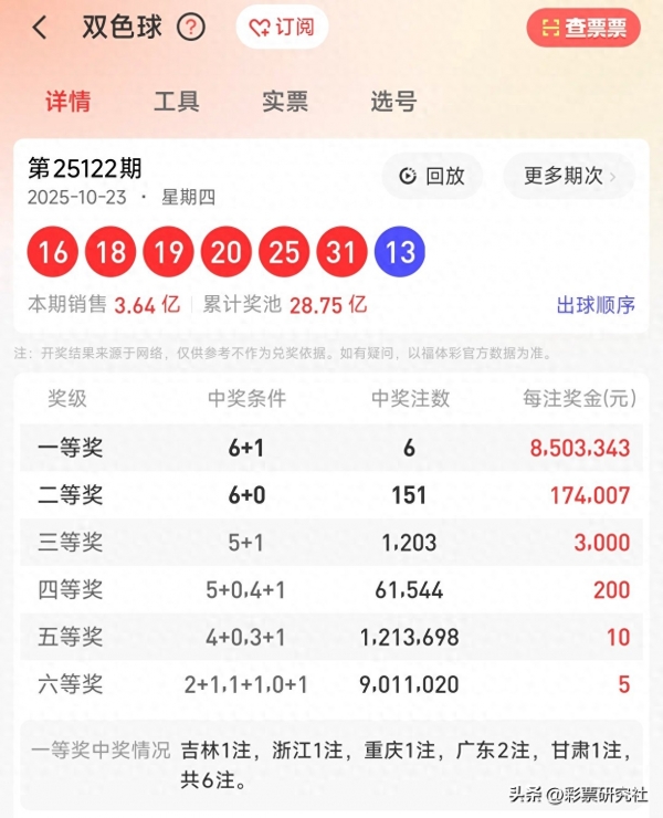 2025年10月23日周四,双色球第25122期开奖结果重磅揭晓,本期不仅诞生6注850万元级一等奖,28.75亿的累计奖池更是引发彩民广泛关注。以下是本期开奖的全方位解析。