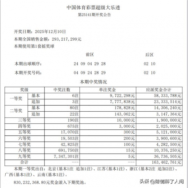 大家好!今天是12月10日,周三,今晚大乐透25141期开奖,在上期大乐透开出3注一等奖后,本期大乐透奖池滚存为8.5亿。本期开奖号码:前区:4、9、24、28、29后区:2、10,后区开出了2个2路偶数号码2号和10号,和值12点。