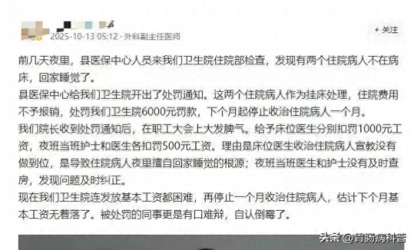 住院病人溜回家睡觉,医生罚一千,护士罚五百!这可不是危言耸听,而是近期多地医院实实在在发生的处罚。江苏一家卫生院就栽了跟头,县医保中心夜间突击检查,发现两个病床空着,病人回家睡大觉去了。结果呢?住院费用医保不报销,医院还被罚了六千块,下个月连收住院病人的资格都暂停了。