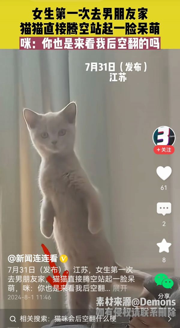 女生第一次去男朋友家,猫猫直接腾空站起一脸呆萌。盯着女生一直看,一脸好奇加困惑,完全没有害怕躲起来,也是社牛猫咪啊。照它这个看法,最后它没害羞,刚进门的女朋友反倒害羞了。就算要打量,也没别这么可了劲的盯着看啊。