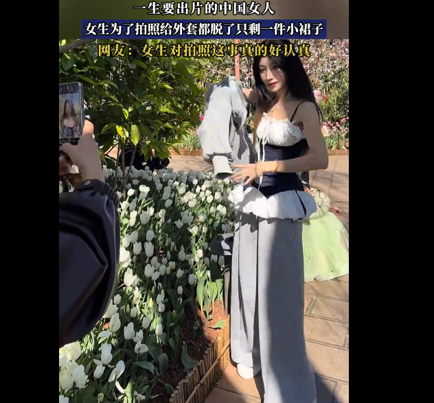 一生要出片的中国女人,据视频显示,女生为了拍照给外套都脱了只剩一件小裙子。