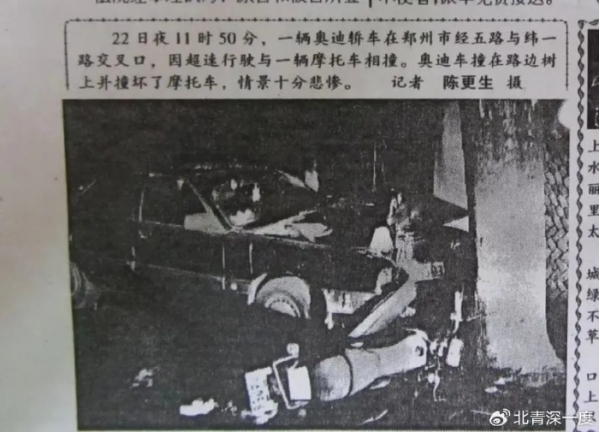 当年,大河报对奥迪车撞击摩托的交通事故进行了报道 ,当时,王文海找人顶包,逃避了事故责任