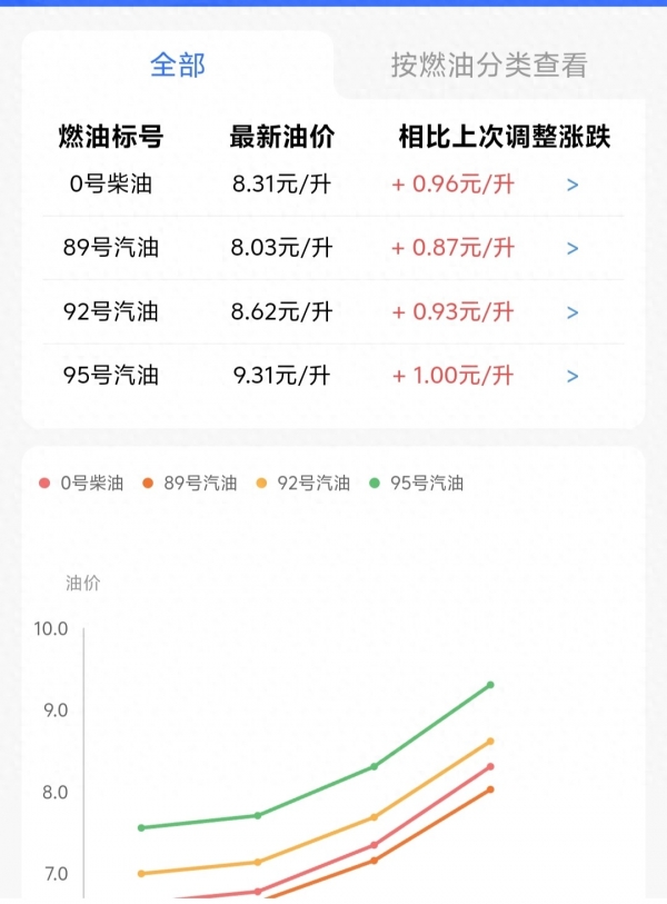 - 95号汽油每升上调约1.01元