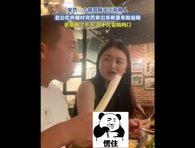情侣吃西餐时男生突然拿出根大葱来抱着啃,女友看到这一幕都愣住了,男生还把大葱递给女友让她也吃,结果女友满眼嫌弃,还让男生把大葱藏起来,谁能想到下一秒女友也忍不住了就啃了一口,没想到却停不下来了,又啃了一口还说着好吃。