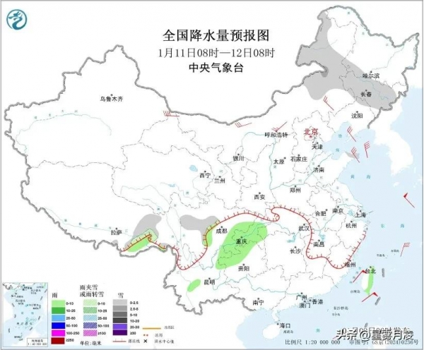11日08时至12日08时,降雪明显减弱,内蒙古东部、东北地区中部、西藏东部、川西高原北部等地部分地区有小到中雪或雨夹雪。四川盆地西部和东部、湖北西南部、贵州北部、云南东北部、西藏东南部等地部分地区有小雨。