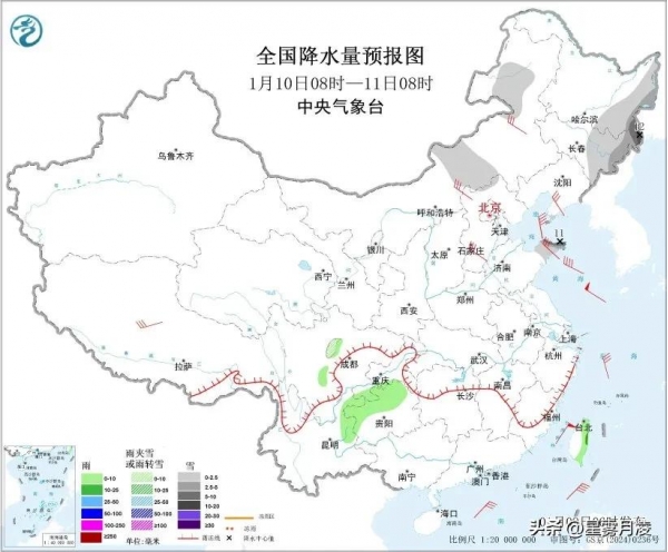 10日08时至11日08时,降雪区域东移,内蒙古中部和东北部、东北地区东部、山东半岛东部等地部分地区有小到中雪,黑龙江东南部、吉林东部、山东半岛东北部等地部分地区有大到暴雪,降雪量10到12毫米。贵州西部和北部、云南东北部、台湾岛等地部分地区有小雨。