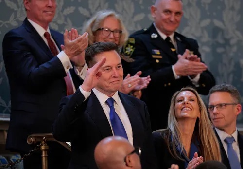 当天,马斯克穿着西装打着领带出席演讲。一些民主党人戴着蓝色和黄色的围巾,以示对乌克兰的支持。此前一天,特朗普暂停了美国对乌克兰的所有军事援助。
