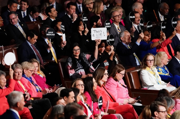 在演讲中,共和党人起立为特朗普欢呼,而民主党人则坐着保持沉默。台下几位民主党议员举着标语,对特朗普进行无声抗议。其中一位议员写道:"马斯克偷窃。"民主党人还举着写有"拯救医疗补助"、"保护医疗补助"、"保护退伍军人"的标语。