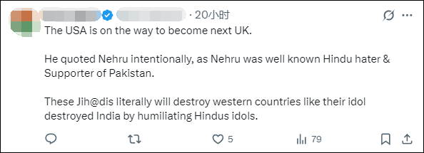 有人认为,美国正在变成下一个英国,马姆达尼是在故意引用尼赫鲁的话,因为尼赫鲁是众所周知的印度教仇恨者和巴基斯坦的支持者。"这些圣战分子会像他们的偶像,通过羞辱印度教偶像摧毁印度一样,来彻底摧毁西方国家。"