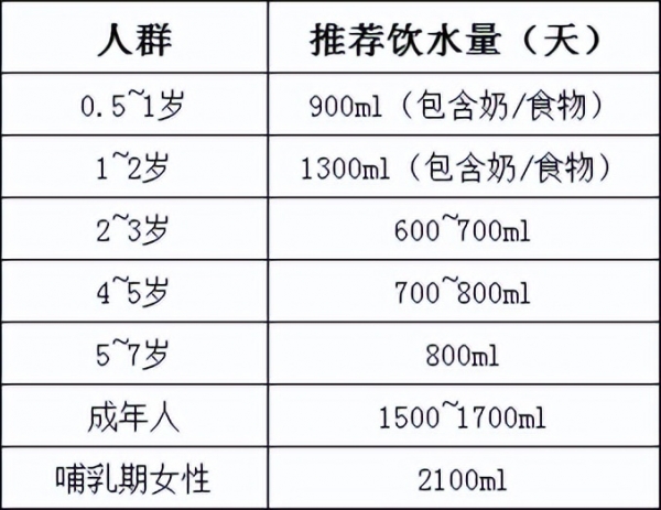 据《中国居民膳食指南》建议,不同年龄段的人群所需的饮水量也不同,具体如下: