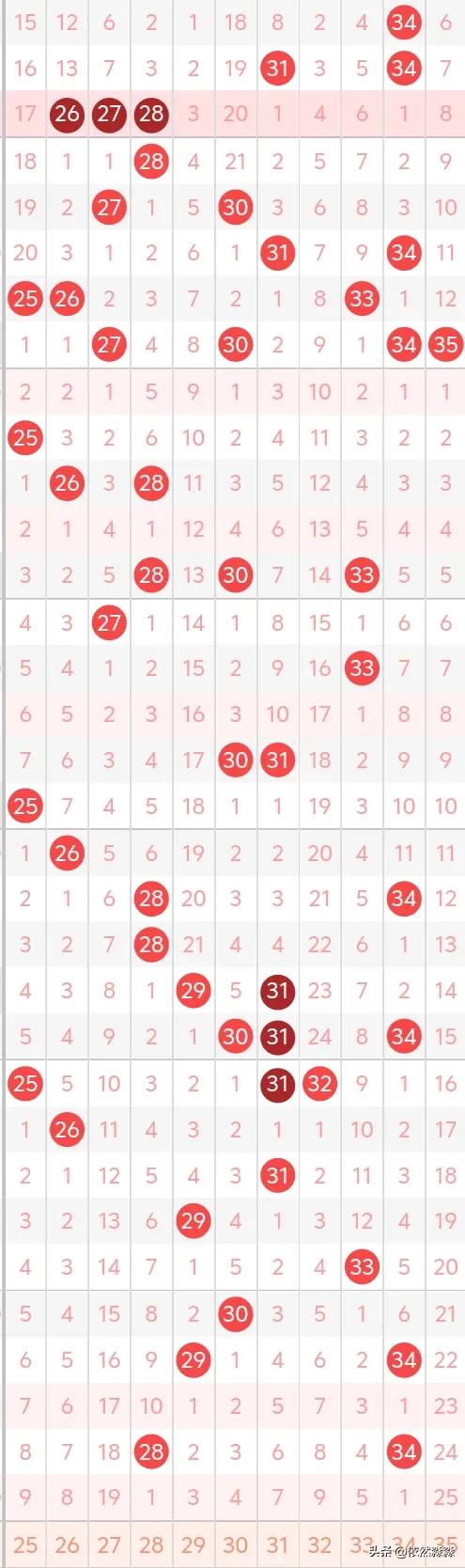 前三区:仅隔1期后再次断区,回补号码以热号为主,冷号概率较低,25、32均遗漏9期,冷号27、35,不看好29、30、34,比较看好25、27、28、31、32、33。