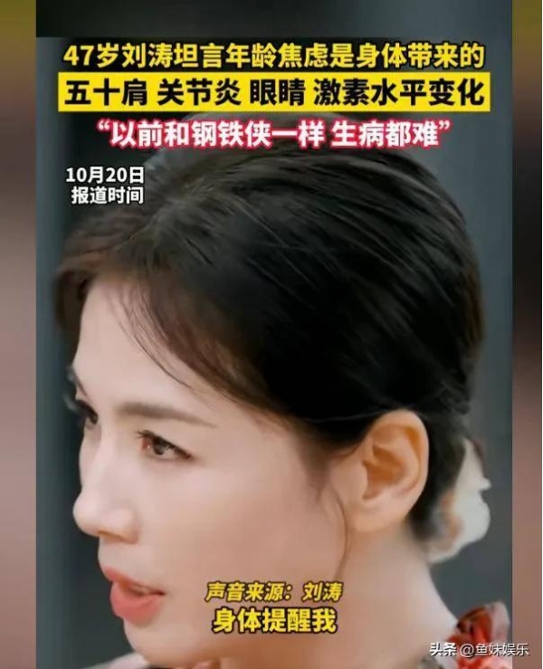 娱乐圈又传来让人揪心的消息!继大S、朱媛媛等明星的健康问题引发关注后,47岁的"拼命三娘"刘涛也在综艺节目中自曝身体出现问题。视频中的她尽管画着精致妆容,却难掩眼神里的疲惫,坦言"手臂抬不起来、关节炎,一会这不行一会那不行",让粉丝们心疼不已。