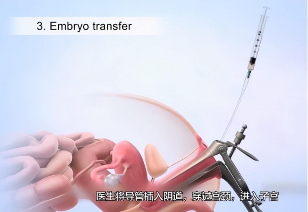 首先,将窥阴器置入女性阴道,使子宫颈暴露。然后,将含有孵化完成的胚胎悬浮液的注射器,与一根细长的导管连接起来。接着将导管插入阴道,进入子宫,再将胚胎注入子宫内。