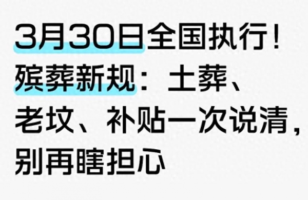 1. 3月30日全国执行,依据是国务院令第824号《殡葬管理条例》,官方权威,绝非小道消息;