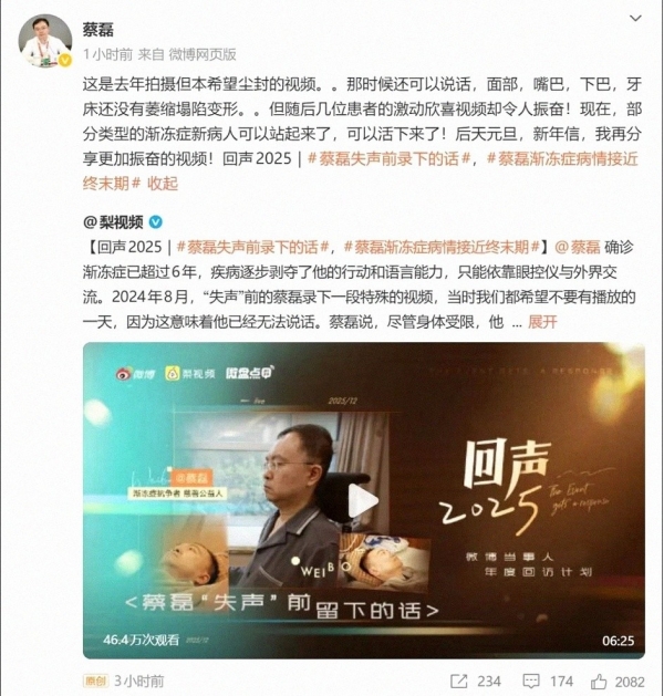 确诊六年后宣布病情逼近终末期的蔡磊,已完全失声,只能用眼控仪与外界说话
