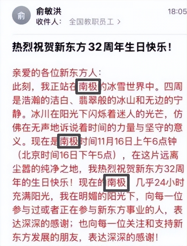 事情是这样的。11 月 16 日是新东方成立 32 周年的日子,按理说该是全司员工一同庆祝的好日子,但新东方创始人俞敏洪没在工位,身处南极发了一封内部信。