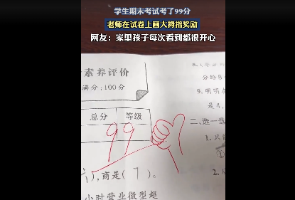 学生期末考试考了99分,老师在试卷上画大拇指奖励。